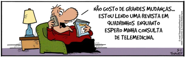 Disponível em: https://drauziovarella.uol.com.br/coluna-2/telemedicina-o-papel-do-paciente-e-o-papel-do-medico-coluna/ (Adaptado)