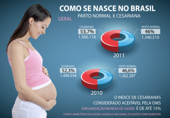 Mais da metade dos 2,9 milhões de partos anuais (55%) são cirúrgicos. De acordo com dados do Ministério da Saúde (2014), 40% dos brasileiros que vêm ao mundo na rede pública nascem dessa forma. Na rede privada, os números são ainda mais alarmantes, 84%. Segundo a Organização Mundial da Saúde (OMS), a porcentagem adequada gira em 1torno dos 15%, pois a cirurgia só é indicada em casos emergenciais e que põe em risco a gestante e o bebê.