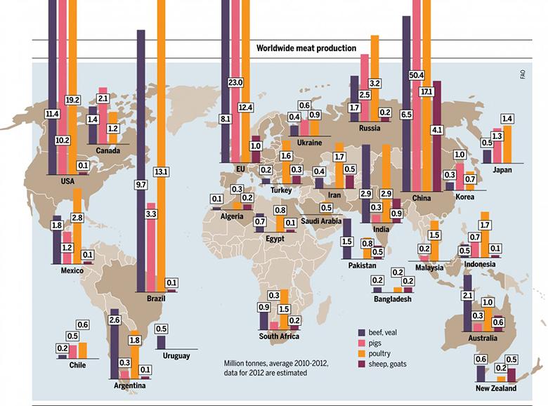 A demanda global por carne está crescendo, particularmente na China e Índia, onde podemos ver um aumento de 80% no setor em 2012, graças ao surgimento de uma nova classe média (fenômeno também observado no Brasil).