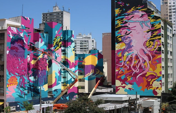 Intervenção artística, com curadoria do artista Felipe Yung, o Flip, e do produtor cultural Kleber Pagú transformará o Centro de São Paulo em mar e nos rios amazônicos. “Aquário Urbano”, grafite gigante que será produzido ao lado Copan, pretende bater o recorde do Guinness, com 10 mil m² grafitados. Ao todo serão revitalizados 15 prédios e 15 empenas, paredes laterais dos imóveis, que receberão os desenhos de temas aquáticos como polvos, águas-vivas e peixes da Amazônia que criarão a sensação de imersão no mar e em rios, no público que circula pelo local. A finalização da obra pode ser conferida entre março e abril de 2020.