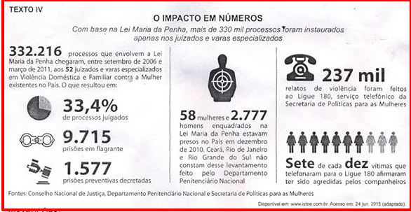A partir da leitura dos textos motivadores seguintes e com base nos conhecimentos construídos ao longo de sua formação, redija um texto dissertativo-argumentativo na modalidade escrita formal da língua portuguesa sobre o tema “A persistência da violência contra a mulher na sociedade brasileira”, apresentando proposta de intervenção que respeite os direitos humanos. Selecione, organize e relacione, de forma coerente e coesa, argumentos e fatos para defesa de seu ponto de vista.
